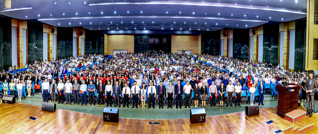 全场师生起立同唱国歌,并观看新华社纪念五四运动100周年视频《一百年华,归来的你依然青春》。