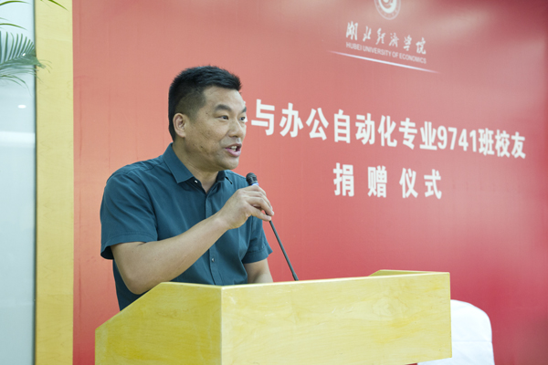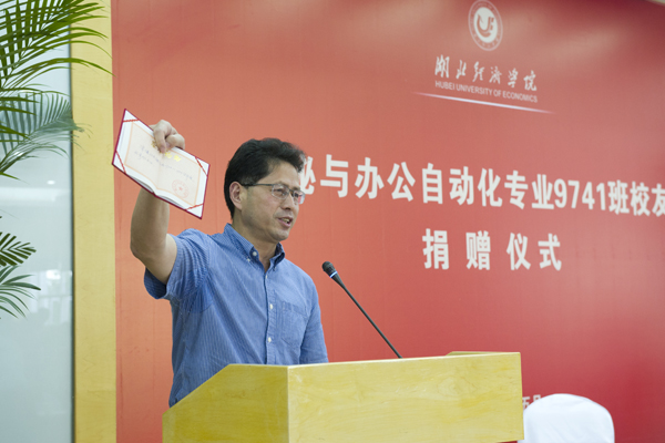 副校长、教育发展基金会理事长吴显富与校友王斌签署《湖北经济学院捐赠协议书》并接受捐赠。党委常委、教育发展基金会副理事长张以林为校友颁发捐赠证书,赠送校友纪念册。
