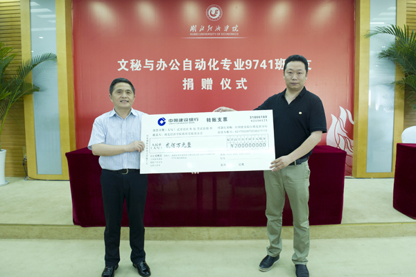本网讯 5月28日,原湖北省计划管理干部学院文秘与办公自动化专业9741班校友向学校教育发展基金会捐赠人民币200万元,支持学校事业发展。校领导董仕节、吴显富、张以林出席捐赠仪式。副校长何慧刚主持。