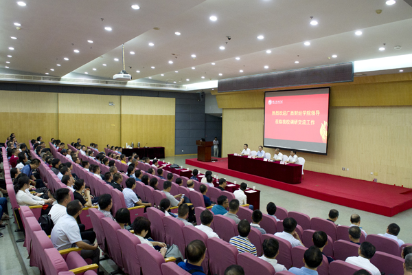 本网讯 8月25日,广西财经学院党委书记韦春北、校长夏飞率该校干部调研团170人来校参访交流。校领导温兴生、董仕节、鲁晓成、何慧刚,广西财经学院校领导韦泽红、潘慧、曾凡平、廖文龙、黄朝阳、韦增忠出席交流会。