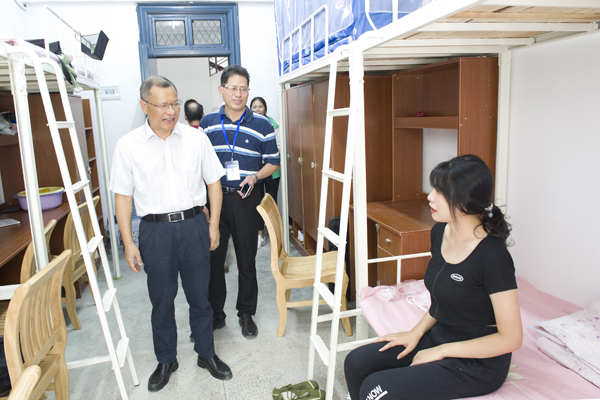 温兴生一行还深入到学生公寓关心新生入住情况。“你们来自哪里?孩子学什么专业?入住感觉怎么样?”在桔苑学生公寓七号楼,温兴生热情地同新生及家长交流,并具体询问宿舍水、电、空调等使用情况。