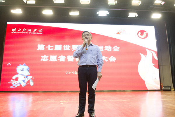 温兴生在讲话中指出,第七届世界军人运动会是习近平总书记和中央军委做出的重大决策部署,是党的十九大之后举办的规模最大、规格最高的综合性体育赛事,参与军运会志愿服务工作是经院的荣光、经院人的荣耀、经院志愿者的责任。