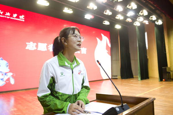志愿者代表、注会Q1743李沁怡发言。她说,军运会志愿者的身份意味着责任与担当,经院“小水杉”们会弘扬中华文化,传播志愿精神;不负军运所托,提交满意答卷;践行“三有三实”,传承经院精神,以最饱满的精神、最优质的服务做好志愿服务工作。