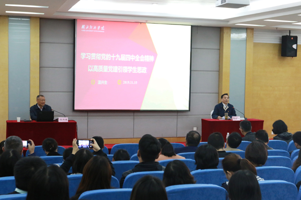 11月15日,校党委书记温兴生以《学习贯彻党的十九届四中全会精神,以高质量党建引领学生思政》为题,讲授主题教育专题党课。省委第十二巡回指导组成员梅红、周波出席,组织部、宣传部和研究生党委负责人,学校办公室党支部和学工团委党支部全体党员,二级学院党委书记、副书记、全体辅导员,以及金融学院、财政与公共管理学院领导班子成员、师生党员代表200余人一起听课。