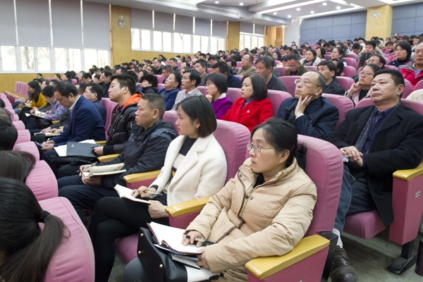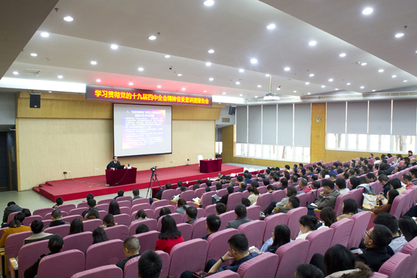 本网讯 12月2日,省委宣讲团成员,华中科技大学国家治理研究院院长、哲学研究所所长欧阳康教授来校宣讲党的十九届四中全会精神。校党委书记温兴生主持报告会。校党委委员、校纪委委员、全体中层正副职干部、教师党支部书记、全体辅导员、全体机关工作人员、学生代表500余人参加学习。