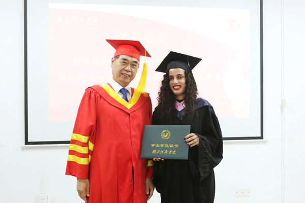董仕节为留学生一一拨穗、颁授学位证书、合影留念。经济与贸易学院负责人宣读学士学位授予名单,国际教育学院负责人颁发本科毕业证书,授课教师代表和学生们座谈并合影。