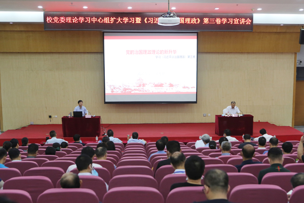 本网讯 8月28日,校党委中心组扩大学习暨《习近平谈治国理政》第三卷学习宣讲会举行。校党委书记温兴生主持,校领导董仕节、刘大洪、鲁晓成、何慧刚、张以林出席,学校四级职员、全体中层正副职干部、校学术委员会秘书长、企业化实体主要负责人参加学习。