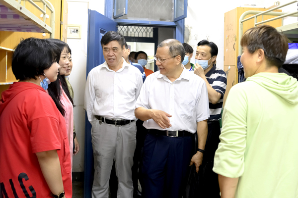 温兴生、董仕节一行还深入学生宿舍看望新生。在桔苑学生公寓五号楼,温兴生热情地同新生及家长交流,了解学生相关信息,询问寝室居住环境是否习惯,并表示学校会做好疫情防控工作,保证防疫措施到位,保障学生身体健康安全,请家长们放心。董仕节表达了对新生的希冀:“希望孩子们能够在学业上学有所获、学有所成,愉快充实地度过大学四年。”