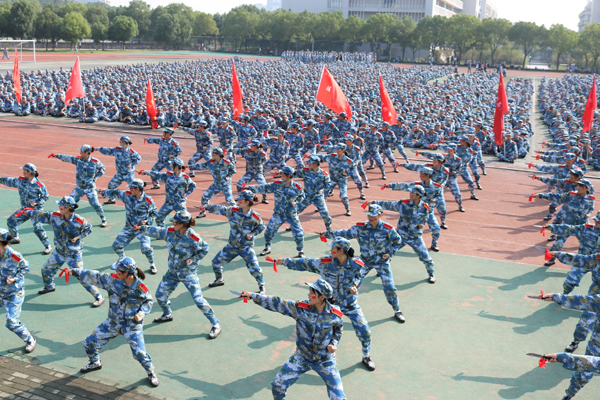 会操表演开始后,军体拳方队以10×10的队形展开,精神抖擞,气势恢宏;匕首操方队以11×10的队形展开,动作整齐,身姿矫健,高喊“厚德博学,敢为人先,冲锋在前,荣我经院”的口号,引得场内掌声阵阵。