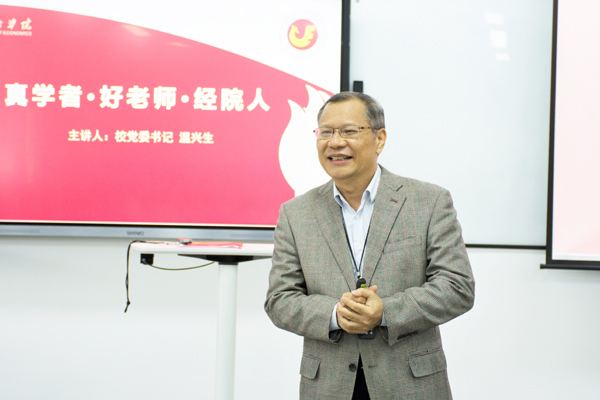 温兴生从女排故事、登山故事、经院故事谈起,饱含深情地回忆了学校18年来不断成长的风雨历程。他指出,学校办学治校的理念是“以学生为中心,以教师为根本”,办学治校是为了落实立德树人根本任务,培养中国特色社会主义建设者和接班人,办学治校要依靠一支“真学者·好老师·经院人”的教师队伍。