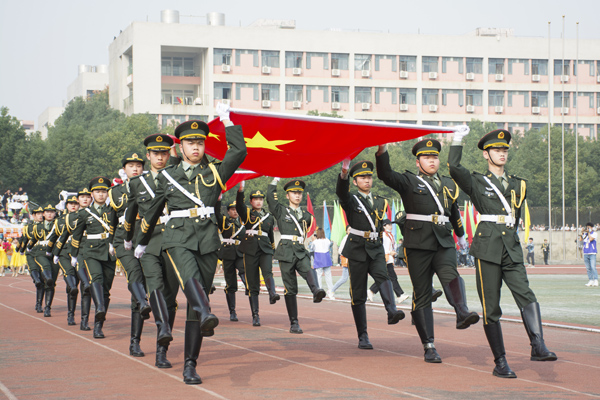 伴随着运动员进行曲,国旗护卫队队员们昂首挺胸,步伐铿锵,护送国旗、校旗和第十七届体育运动会会旗经过主席台。