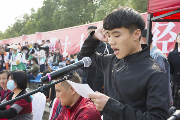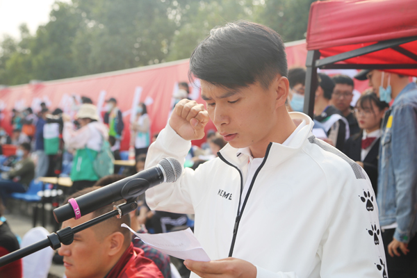 体育经济与管理学院胡俊老师作为裁判员代表宣誓,休闲体育Q1841谭兵作为运动员代表宣誓。二人表示尊重体育精神,遵守和服从竞赛纪律。
