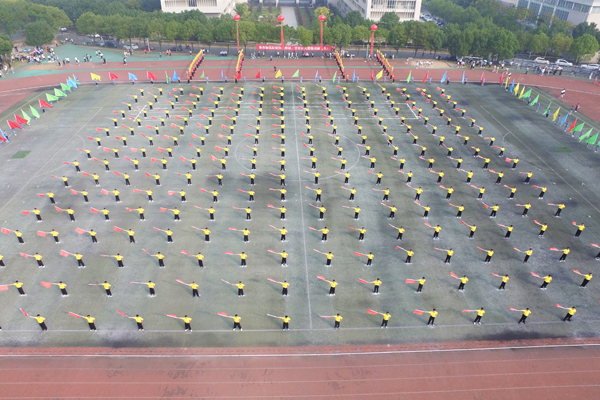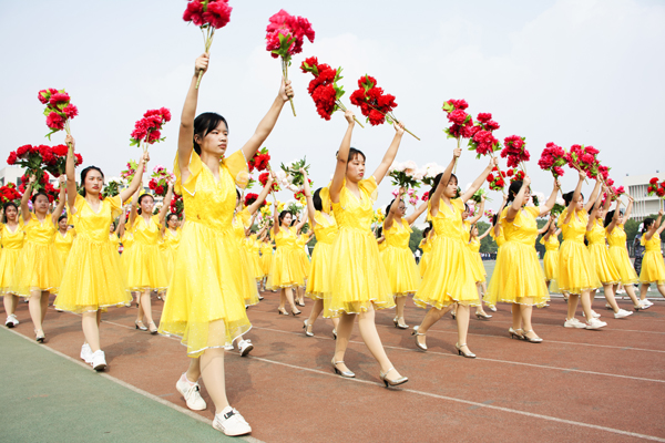 身穿黄色连衣裙的鲜花队员手捧鲜花,不断变换队形,青春洋溢。彩旗队员挥舞着五颜六色的旗帜,气势非凡。