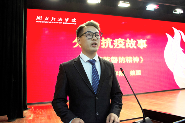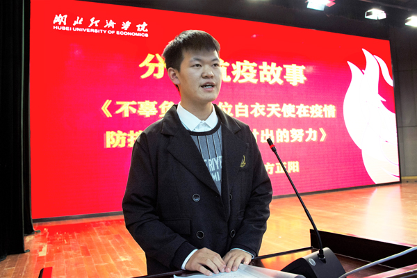 外国语学院方正阳同学的母亲是鄂州市第三医院感染科护士长,他讲述了母亲主动请缨参加抗疫的故事。出于共产党员的职责和医护工作者的责任,方正阳的母亲主动请缨到抗疫一线救治患者,每天忙碌地工作只能睡三四个小时。当方正阳告知母亲,学校需要将寝室作为隔离点时,她表示,国是千万家,有国才有家,要理解并支持抗疫工作。“疫情尚未完全结束,我们需要继续做好防护,不辜负每一位白衣天使在疫情防控战‘疫’中付出的努力!”方正阳说。