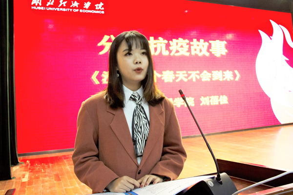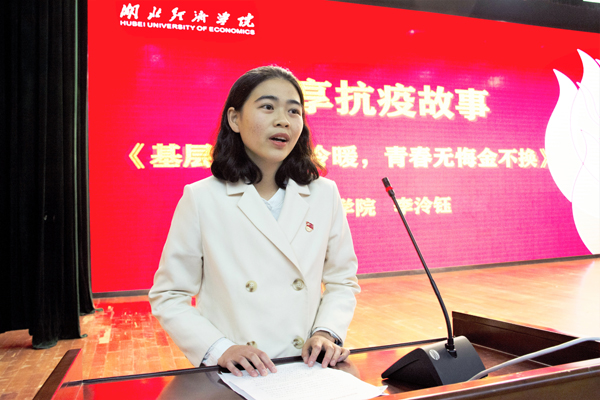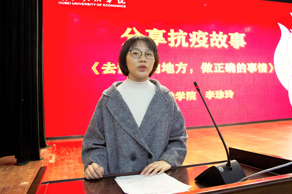 金融学院李珍玲同学疫情期间在家乡参加志愿者服务活动。她现场讲述了志愿服务过程中遇到的一位为自己买药舍不得多花5元钱却主动捐赠1000元的老人的故事。她说:“每一位普通人的微弱力量汇聚成战胜疫情的磅礴之力!我们也会长大,然后去该去的地方,做正确的事情。中华民族伟大复兴的中国梦终将在一代代青年的接力奋斗中变为现实。”
