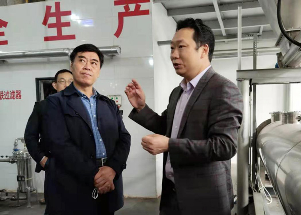 董仕节一行在皇觉氏集团董事长兼总裁王斌校友陪同下,参观了公司的生产车间。王斌校友介绍了公司的成长历程、未来发展规划以及疫情期间公司为保障武汉食品市场供应所付出的努力。