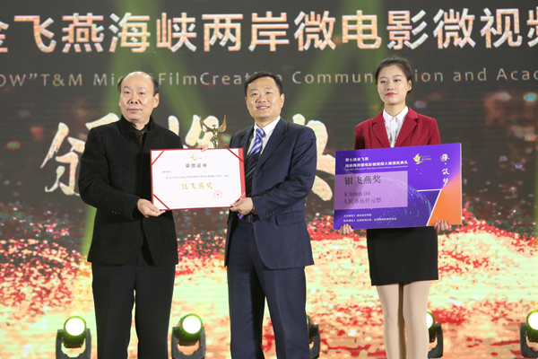 作品《穿越爱情史》《鸡蛋糕之执念篇》《约定》获“铜飞燕”奖,何慧刚、张世熙、陈士农为获奖者颁奖并合影留念。