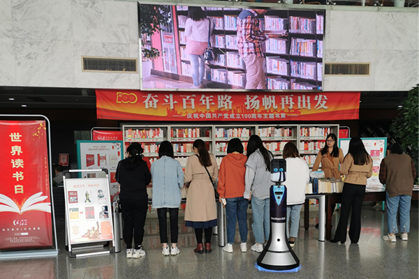 今年的4月23日是第26个“世界读书日”,图书馆与校团委联合举办了“回望光辉百年、携手徜徉书海”主题读书节活动,为期2个月,内容丰富。馆内大厅开展“好书推荐会”,集中展出优秀图书和报刊;智能机器人“小博”向来往读者介绍读书节系列活动。馆外中兴广场开展“书影长廊”“换客会”“数字资源展台”“倍阅充电站”等活动。