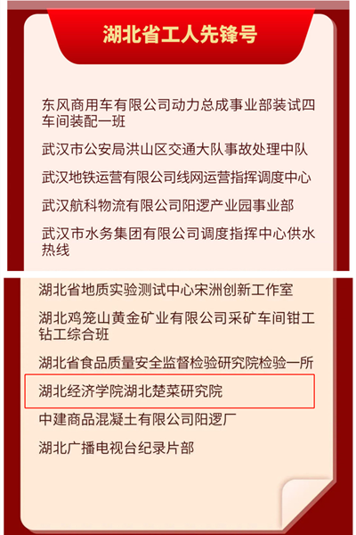我校湖北楚菜研究院被授予2020年度湖北省“工人先锋号”荣誉称号,旅游与酒店管理学院教师沈思静被授予2020年度湖北省“五一劳动奖章”荣誉称号。