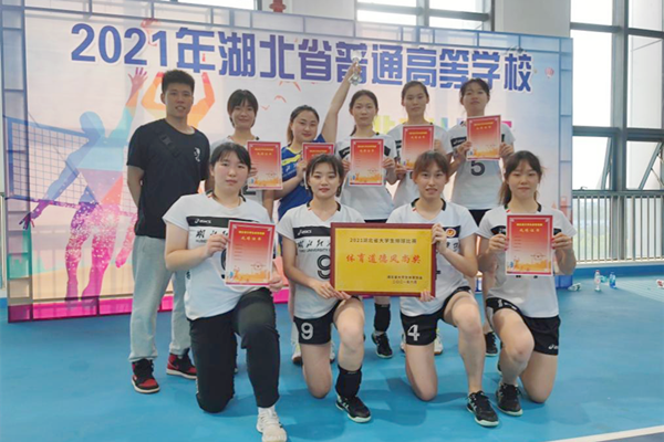 本网讯(通讯员 英俊)6月10日至13日,2021年湖北省普通高等学校排球比赛在江汉大学举行。我校女子排球队获得高水平组亚军,并荣获“体育道德风尚奖”,主教练王文振获得“优秀教练员”荣誉称号,宋晗槟、鲁依凡荣获“优秀运动员”荣誉称号。