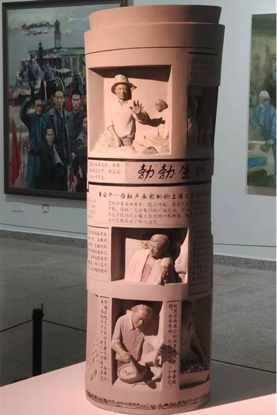 《生机勃勃》以1982年10月23日《湖北日报》的新闻报道为原型,通过圆雕和高浮雕结合的表现手法,将家庭联产承包责任制报道的不同专业户进行了集中展示刻画,呈现了土壤中长出新苗,农民得到实惠,农村焕发勃勃生机的场景。创作主体设定为一张卷起来为“火炬样”的报纸,寓意着联产承包责任制给人民生活带来的力量与指引。