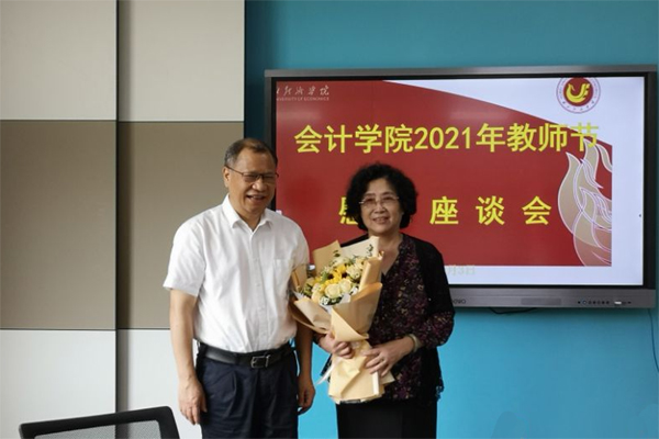 温兴生向退休教师代表查晓岚教授献花,并代表学校党委、行政向会计学院参会教师代表及全院教职工送上节日的祝福和问候。温兴生表示,在常态化疫情防控背景下举行教师节座谈会,表达学校的关心,听取教师的心声,与老师们一道畅谈节日感受体会,展望学校改革发展前景,有利于进一步加强学校教师队伍建设,努力提升教职工的归属感和幸福感。
