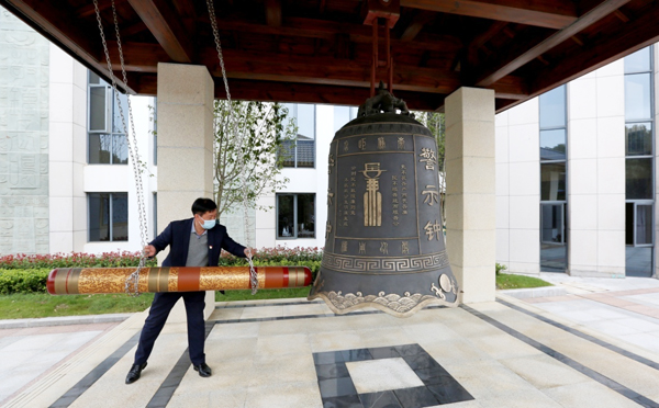 参观完展厅大楼后,全体参观人员在廉政广场上,分四列整齐列队在警示钟前,许传华拉开钟锤,庄重敲响三下廉政警钟,代表全体新当选的第四届党委委员、纪委委员和新提任的中层领导干部、关键职能处室负责人作出廉洁履职履责的庄重承诺,钟声入耳入心、振聋发聩。