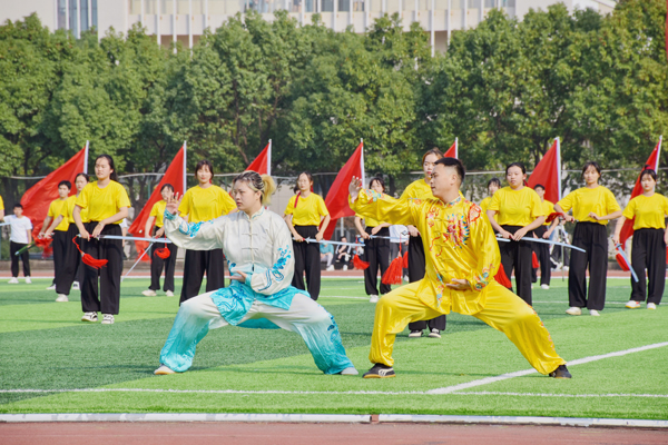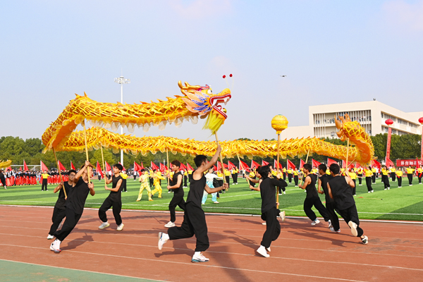开幕式表演“活力经院”精彩纷呈。斗笠在背,红旗在心,伴随着鼓点,表演者们展现出军民鱼水情。身披红黑色的斗篷,舞者在旋转中舞态生风。舞龙表演者通过不同的队形变换,用龙身摆出“2021”的字样,引发欢呼。武术表演静若伏虎,动若飞龙,稳健潇洒。啦啦操方阵队员们随着节拍,踏着动感的鼓点,迈着轻盈的脚步,如跳跃的火焰赢得了全场掌声。