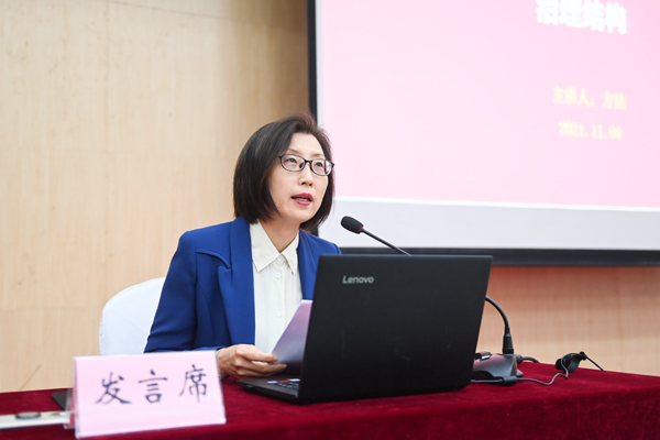 校长方洁作题为《构建与高水平财经大学目标相适应的治理结构》的报告。她强调,要回归常识、抓住本质、尊重规律、注重长远,构建有经院特色的内部治理结构的“四梁八柱”。“四梁”是指人才培养、科学研究、社会服务、文化传承与创新,“八柱”是指党委领导、校长负责、教授治学、民主管理、社会监督、开放办学、制度建设、文化建设。