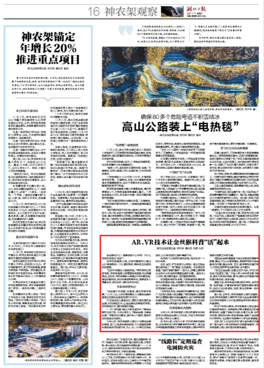 本网讯(通讯员 蒋昕)11月17日,《湖北日报》以“AR、VR技术让金丝猴科普“活”起来”为题报道了神农架国家公园。其中,旅游与酒店管理学院台籍教师潘淑兰副教授与神农架国家公园科学研究院院长杨敬元联合主编的《国宝金丝猴》中小学研学教材受关注。