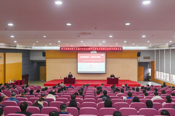 本网讯 12月9日,省委宣讲团成员、华中科技大学马克思主义学院院长岳奎教授来校宣讲党的十九届六中全会精神。校党委书记温兴生主持报告会。校领导方洁、刘大洪、汪达、张国安、付宏、许传华出席。