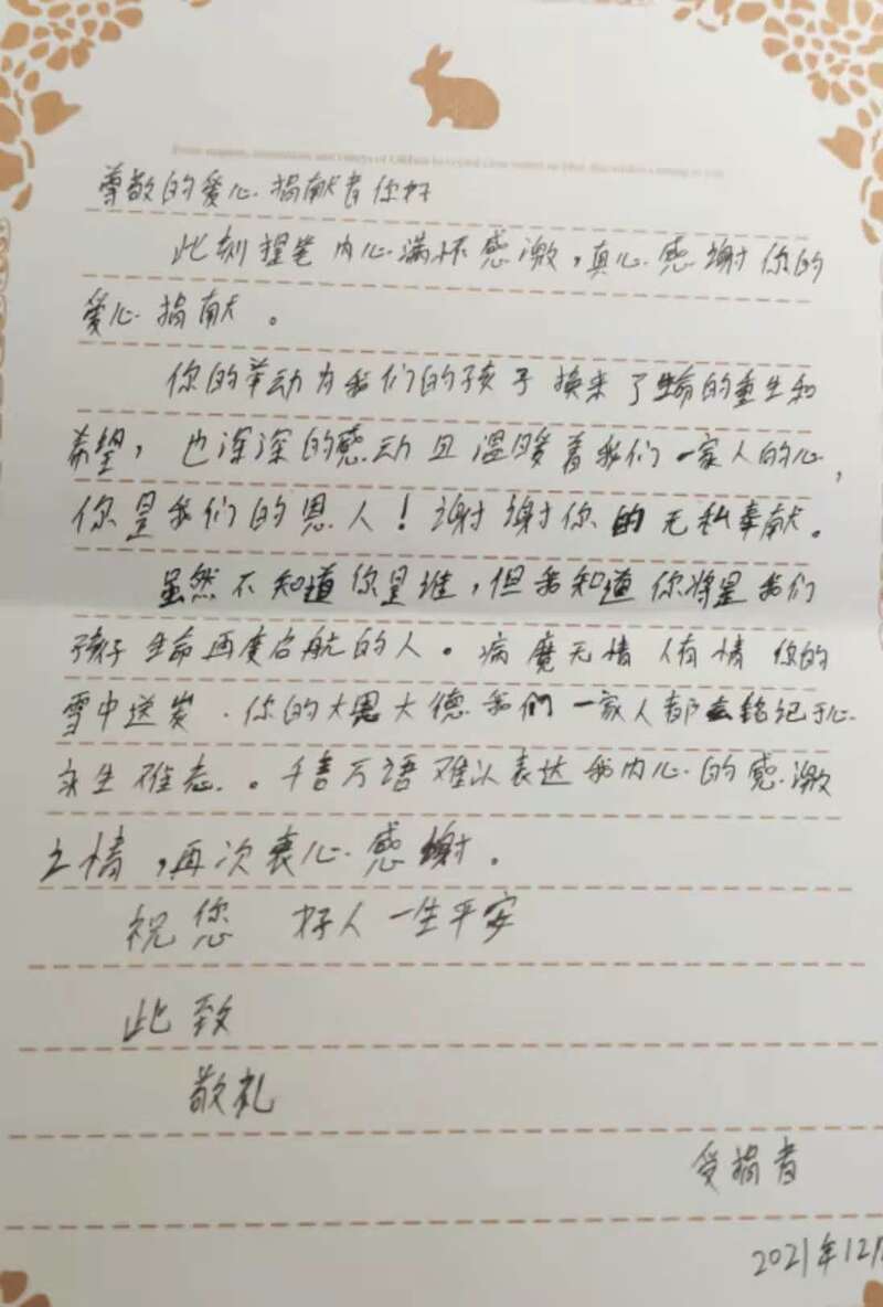此次捐献,患者家属通过红十字会转来感谢信,信中这样写道:“虽然我们未曾谋面,但我们全家时刻都记着感恩您这位远方的亲人,我们也会让孩子记住身体里流着一位远方亲人的血,你是我们孩子生命再度的启航人。”