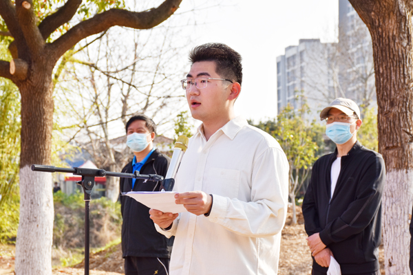 学生代表、信合1941班王瑞作“春暖花开 共创未来”主题演讲,倡导同学们积极参与植树活动,共同守护绿色校园、生态校园。