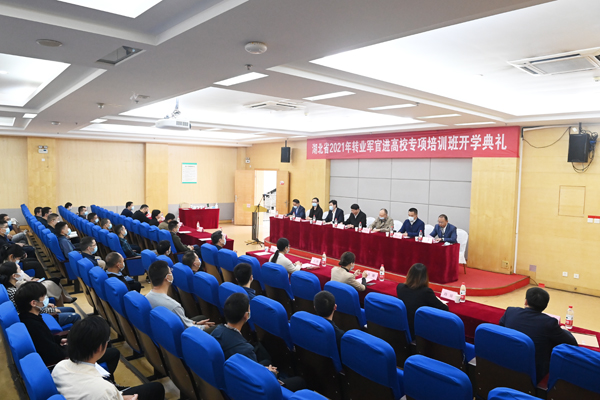 本网讯 4月14日,湖北省2021年转业军官进高校专项培训班开学典礼在大学生活动中心举行。副校长鲁晓成,湖北省退役军人事务厅移交安置处一级调研员严运文,国家税务总局湖北省税务局教育处处长袁宏光出席,有关学院和职能部门负责人,72名培训班学员参加。