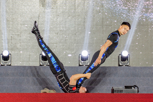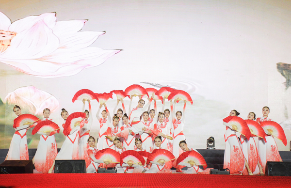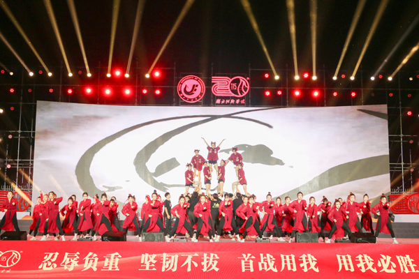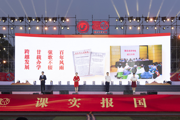 第二篇章“集结号·善作善成”在《经院诵》的诵读声中开启。“静静地走在腾龙大道旁,仰望着香帅楼,看着那腾飞的凤凰……”在诗朗诵中,带着校友重走校园路。杂技《中国力量》,武汉杂技团石洋、孟阳两位国家杂技演员配合默契,高空翻腾、站立、倒立一系列动作扣人心弦。离退休处平均年龄62岁老教师们带来的舞蹈节目《我们的中国梦》,她们双手轻捏红裙衣角,随着音乐节奏的起伏,旋转、舒展,舞姿将具柔美感和力量感结合得恰到好处。大学生艺术团歌唱者穿着印有“HBUE”字样的校庆文化衫,整齐站立舞台中央,共同唱响《星辰大海》。
