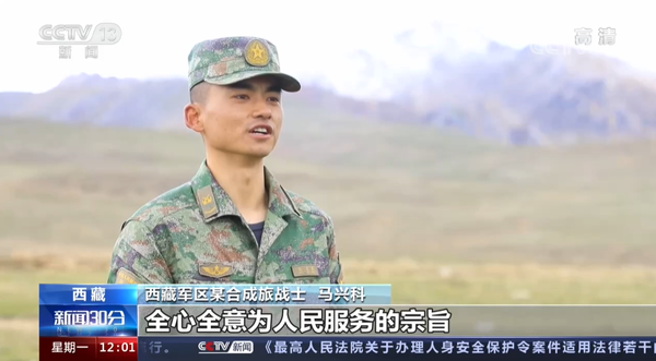 本网讯 8月1日,在央视《新闻30分》栏目上,我校2022届毕业生马兴科作为西藏军区某合成旅战士接受采访。马兴科谈到:“身为军人,我们要始终牢记全心全意为人民服务的宗旨,发扬不怕牺牲、甘于奉献的革命精神,用实际行动筑起捍卫祖国保卫人民的钢铁长城。”