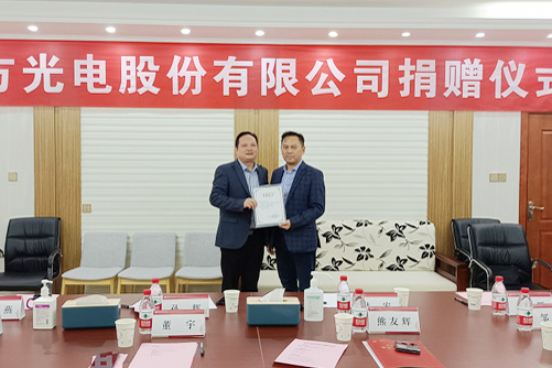 本网讯 10月17日,四方光电股份有限公司向校体育运动委员会捐赠运动服装仪式举行。该公司捐赠运动服装40余套。副校长、校体育运动委员会主任付宏向董事长熊友辉先生表示感谢,并为其颁发捐赠证书。付宏指出,学校积极开展产教融合、校企合作,将按照共赢共建原则,深化双方合作,丰富合作内涵,创新合作形式,实现优势互补、互利共赢。