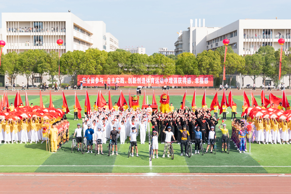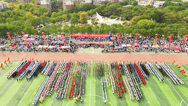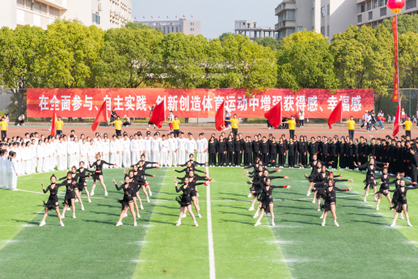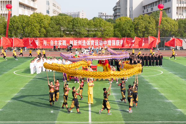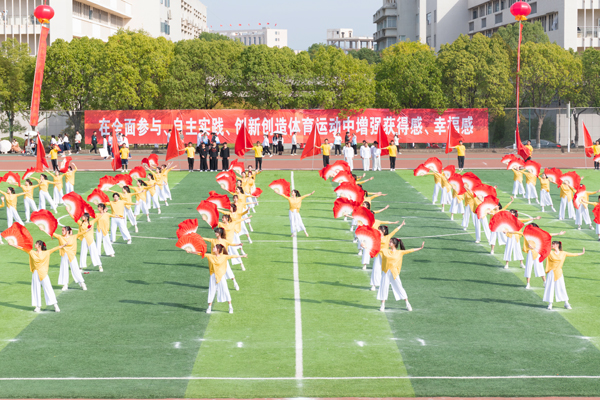 开幕式表演“体教促发展,聚力新跨越”精彩纷呈。体育社团同时上演足球、排球、羽毛球、跆拳道、自行车、栏间练习等技能表演,一踢一挥之间,尽显体育精神。身着黄白服装,手拿红色扇子,艺术体操扇子舞表演柔刚并济,一开一合之间,展现体育之柔美。黑白两队分离而后汇聚,太极表演者双手握拳,转腿、冲拳、推掌,静中藏动机,动中存静意。音乐响起,伴随着动感的节拍,拉丁舞表演者迈着轻快的脚步登场,挥动手臂、扭动腰身,黑色舞裙摆动出优美的弧线,赢得全场喝彩。一只绣球,引出两只威风凛凛的醒狮,醒狮随着锣鼓点翻滚跳跃、闪转腾挪。两条长龙追逐宝珠,上下飞腾、瞬息万变,赢得了全场掌声。