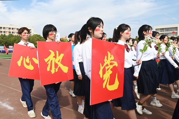 身着白色衬衫和浅灰色短裙的鲜花方阵队员手持缤纷的鲜花,热情洋溢。红旗方阵队员挥舞着红旗,气宇轩昂。