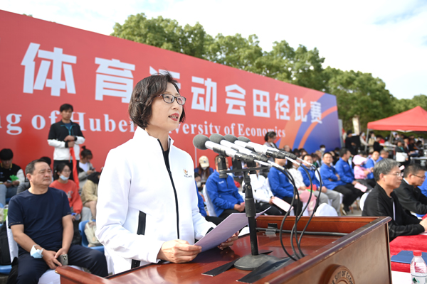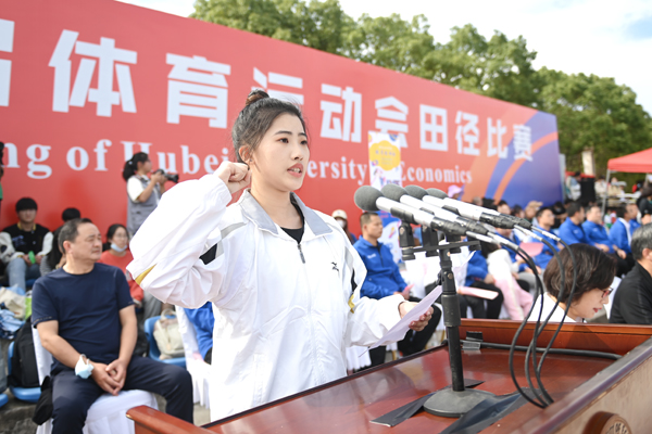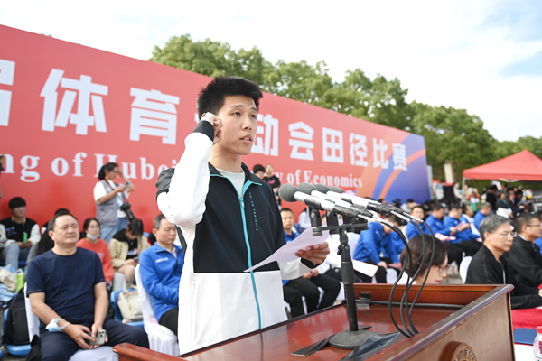 体育经济与管理学院教师王振文作为裁判员代表宣誓,会计2043班张雨欣作为运动员代表宣誓。