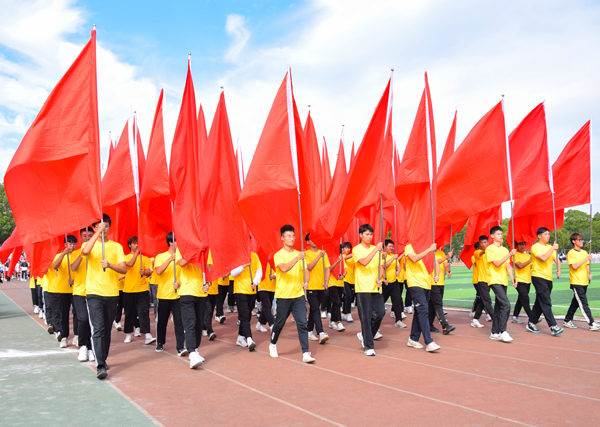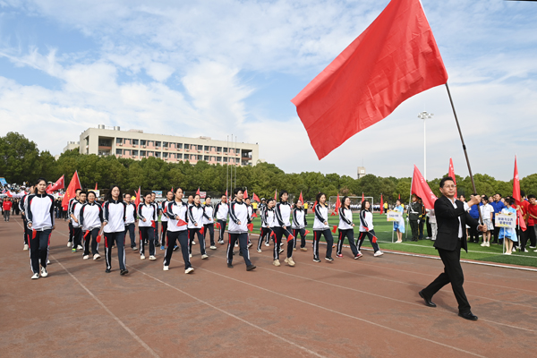 伴随着运动员进行曲,国旗护卫队昂首挺胸、步伐铿锵,护送国旗、校旗和第十九届体育运动会会旗经过主席台。
