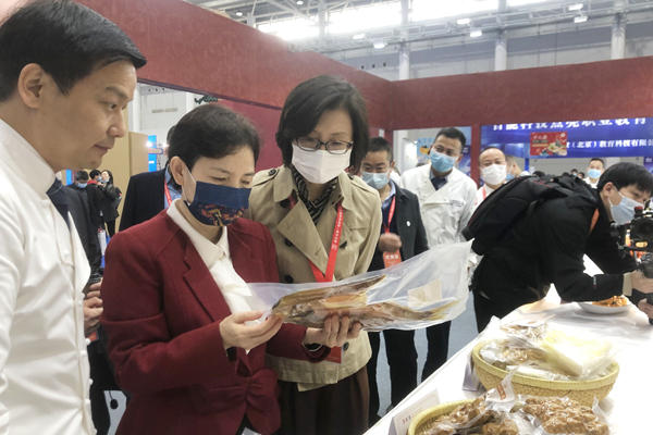 邹志平向刘艳红、方洁介绍楚菜现代产业学院预制菜研发成果