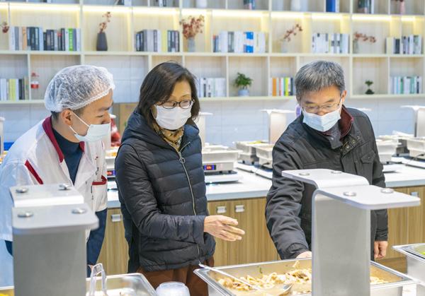 在一粟堂二楼,方洁实地了解学生分流购餐、菜品保障等情况,并与同学们交流,听取大家的意见和建议。