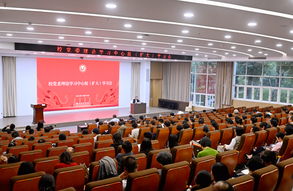 本网讯 10月16日,校党委理论学习中心组(扩大)学习会召开,专题学习研讨《习近平谈治国理政》第五卷。全体在校校领导、中层干部、马克思主义学院教师代表和法商学院干部代表参加。校党委副书记汪达主持。