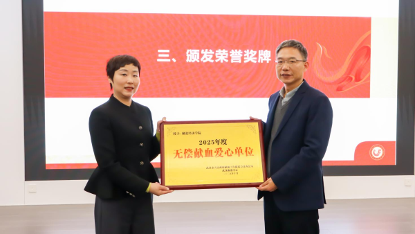 武汉市人民政府献血工作联席会议办公室、武汉血液中心为我校颁发了“2025年度无偿献血爱心单位”荣誉奖牌。