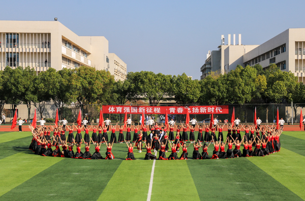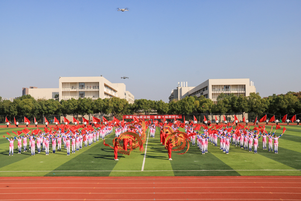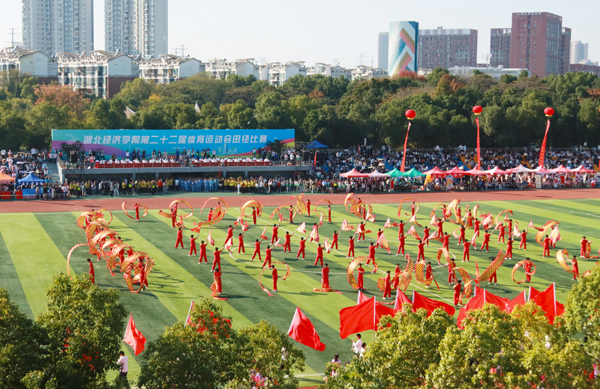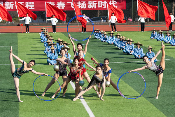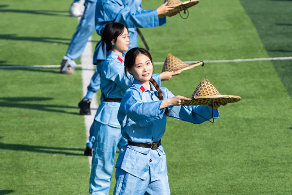大型团体操表演环节,体育经济与管理学院带来的《龙舞山河》,表演者们身着一袭红衣,随着音乐挥动着手中红旗和彩带,彩带飘飘似游龙,展现出经院学子的良好精神风貌。健美操教学俱乐部带来《风起旗舞》,表演者身穿彩衣,手拿红旗,迈着铿锵的步伐,用活力的舞姿表达出青春的激昂。体育舞蹈教学俱乐部表演者踏着《黄河奔腾》的雄浑旋律,款款而来,他们的舞步刚劲有力,以充满张力的身体语言描绘出奔腾不息的黄河画卷。艺术体操教学俱乐部带来舞蹈《舞忆峥嵘》,表演者身穿革命服装,在音乐的行进中奔向操场中央,音乐过半,8名身穿艺术体操服装的表演者入场,她们随着音乐抛动着手中的呼啦圈,展现出艺术体操的独特魅力。