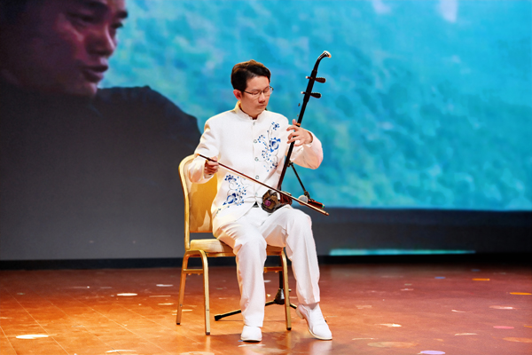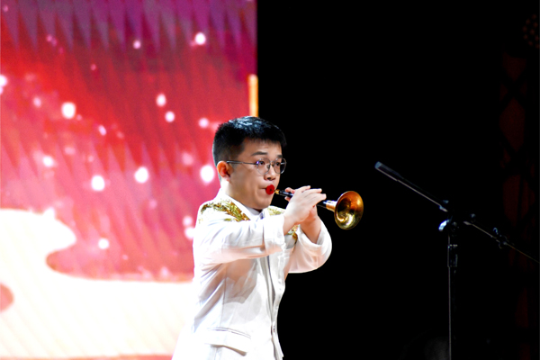 演出开始,杨晨希等十八位听障舞者带来表演《千手观音》,她们身着鎏金服饰,身姿如莲,初始时双手合十,静立如雕塑。随着音乐节奏,舞者们手臂从合十姿态依次舒展,百余只手臂层层叠叠、整齐划一。《百鸟朝凤》的表演者柳广洪一袭白色礼服站在台上,肩上的金片在灯光的照耀下闪闪发光。唢呐声起,高亢嘹亮似凤凰啼鸣划破天际,而后婉转,仿佛麻雀低语,忽而急促,又似百鸟争鸣,尽显生命欢腾活力。蒋毅华与韩永宝带来京剧表演《四郎探母·坐宫》。灯光亮起,蒋毅华一袭红裙,韩永宝一身深色中山装,二人服饰色彩与舞台背景的红梅、帘幕、灯笼等元素呼应,女声清澈嘹亮,男声浑厚有力。听障演员朱之怡、戴鑫带来双人舞《羽翼下的晴空》,一束白光聚焦在朱之怡、戴鑫身上,戴鑫随着朱之怡的节奏,或扶住她的腰侧以提供支撑,或调整步伐与她保持一致,或稳稳地把住重心,确保她的每个动作都流畅稳定。汪钱一袭白衣坐于舞台之上,他通过二胡演绎《太极琴侠》,他以触觉感知琴弦,用音乐诠释太极的刚柔并济,旋律在绵长与急促间流转,模拟出太极拳意的动静转换。视力受限的肖琴与汪罗安献上了一曲《我和我的祖国》,歌词中描绘着“碧波清浪”,抒发着对祖国的深厚情感,旋律落下,掌声如潮,为这场特殊的演出画上了一个温暖而圆满的句号。