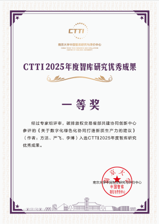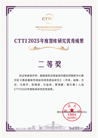 本网讯 日前,2025新型智库治理论坛在南京召开。论坛发布了2025 CTTI智库建设最佳案例和智库研究优秀成果评审结果,碳排放权交易省部共建协同创新中心报送的2项成果获奖,其中由中心主任方洁教授提交的《关于数字化绿色化协同打造新质生产力的建议》报告获评一等奖,经济与贸易学院赵锋教授牵头撰写的《高质量碳市场信用体系建设研究》报告获评二等奖。