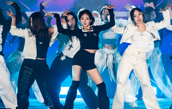 NS舞社带来舞蹈《New beat show》,鼓点落下的瞬间,舞台灯光亮起,舞者们身体顿挫,整齐地跟着每一个重拍,每一次队形变换,都展现出舞者排山倒海的张力。谢幕动作摆出后,全场灯光聚焦舞台,两侧的礼花机“嘭”地炸开,金色彩带漫天纷飞。