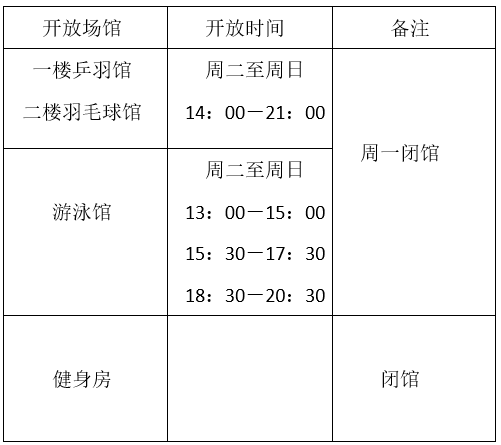 根据学校放假时间安排,寒假期间体育馆内乒羽馆及游泳馆开放时间为2026年1月26日至2月10日(小年),请进馆师生持本人有效证件预约入场,服从工作人员管理。具体开放时间如下: